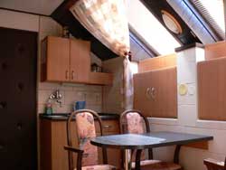 K posezení lze využít stylový salonek nebo společenskou místnost s barevným televizorem, barem a výčepem, která slouží při dlouhodobém pobytu klientů také jako jídelna pro podávání snídaní, nebo jiné formy stravování.
